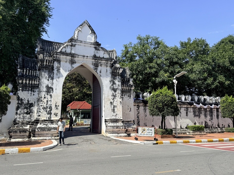 走近那萊王宮的入口,最先看見的不是金碧輝煌,而是一整片純白的宮門與圍牆。