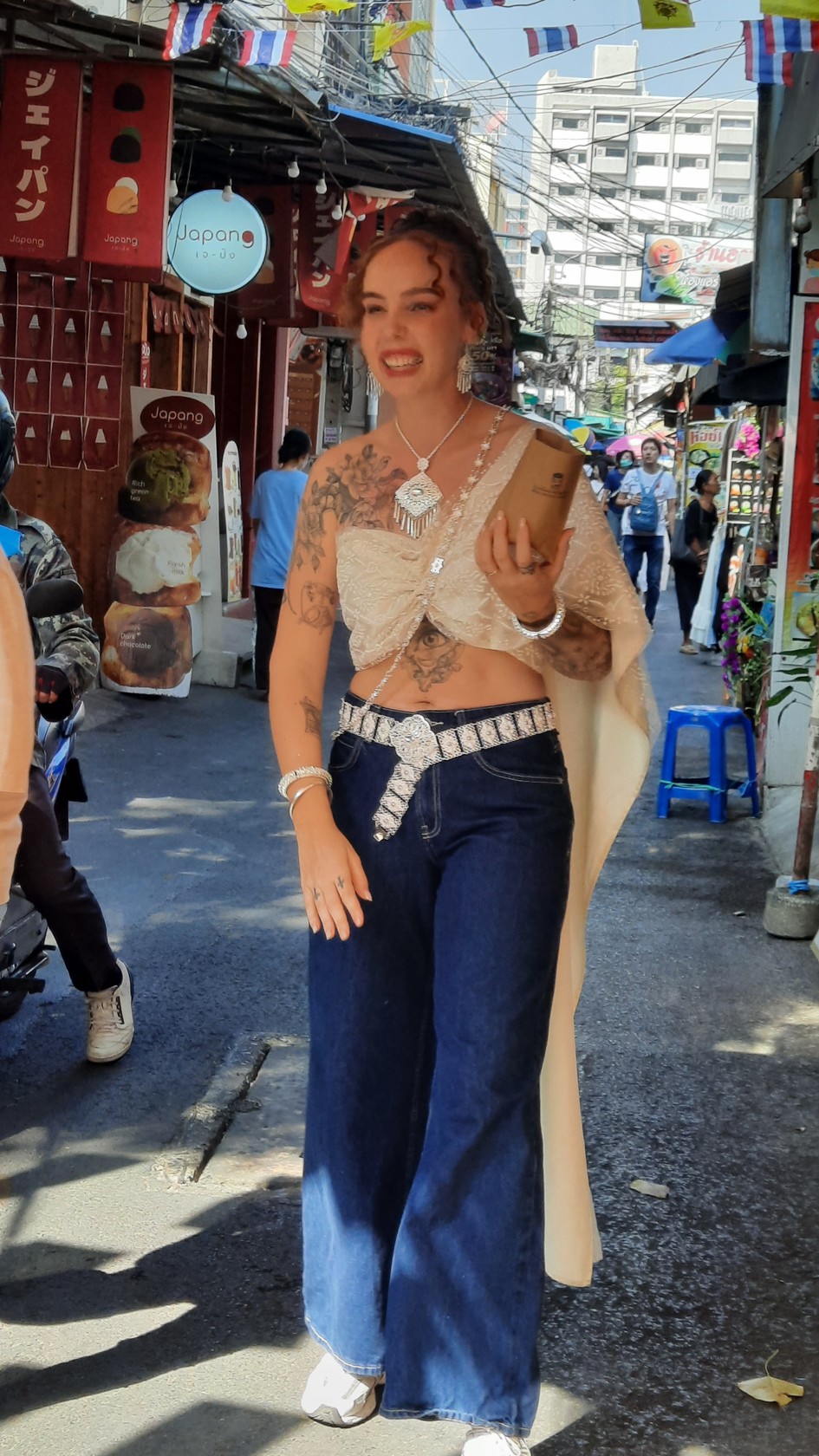 3. 靈魂配件「泰式雕花腰帶」:在披肩與牛仔褲的交界處,繫上一條泰式金屬雕花腰帶。這不僅能固定服裝,更能抓出腰身比例,是整套穿搭畫龍點睛的關鍵。