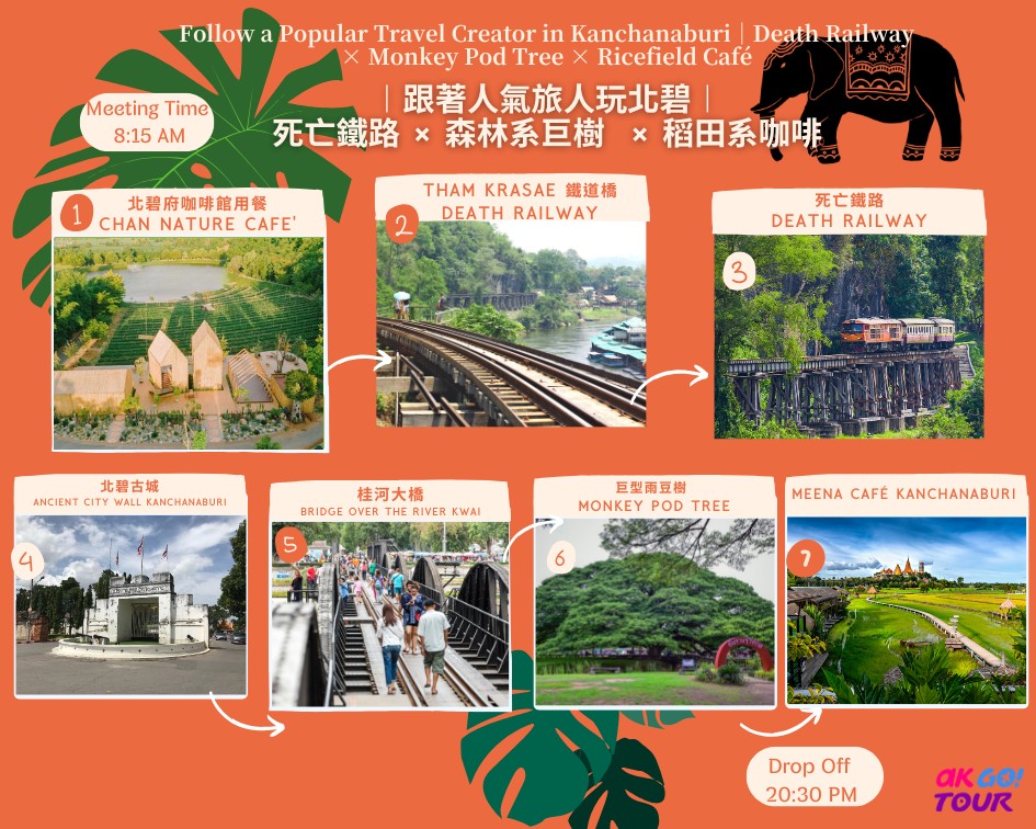 二次大戰日軍強迫盟軍戰俘建造泰緬鐵路,行經桂河大橋之外,還有一段捱著陡峭山壁而蓋的「死亡鐵路」,因為施工困難,建造時犧牲了很多生命。我們會搭乘約20分鐘的火車,經過死亡鐵路景致最壯麗,也是工程最嚴竣的一段。