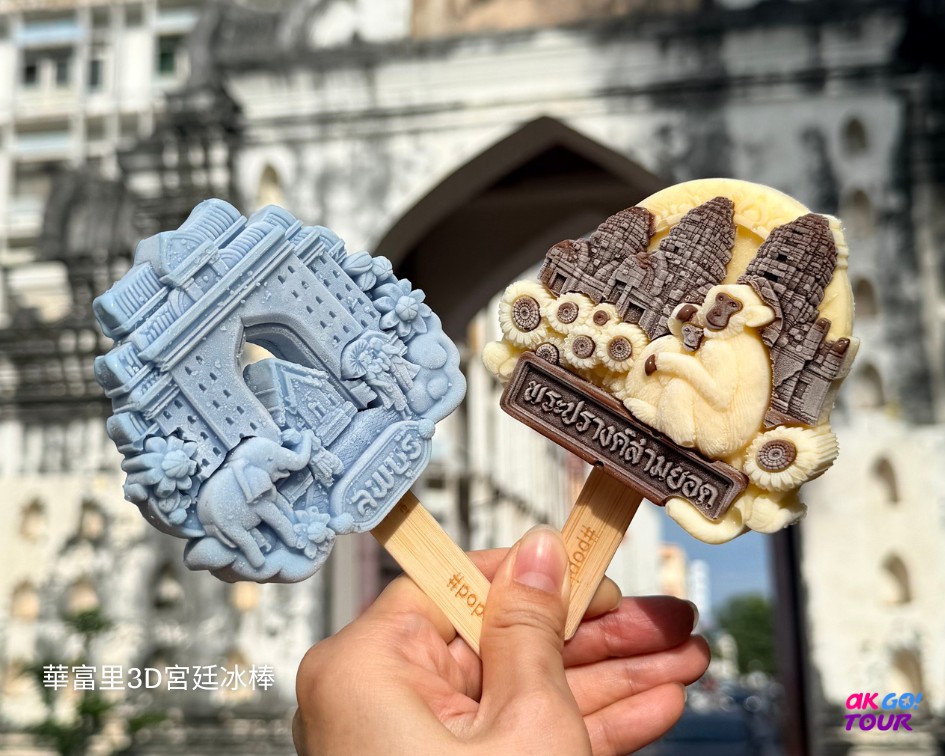 那萊王宮等景點販售古蹟造型3D立體冰棒,是用華富里當地種植的水果為原料製成,不僅支持當地農特產品,也是現在泰國很紅的打卡方式和旅遊熱點哦!