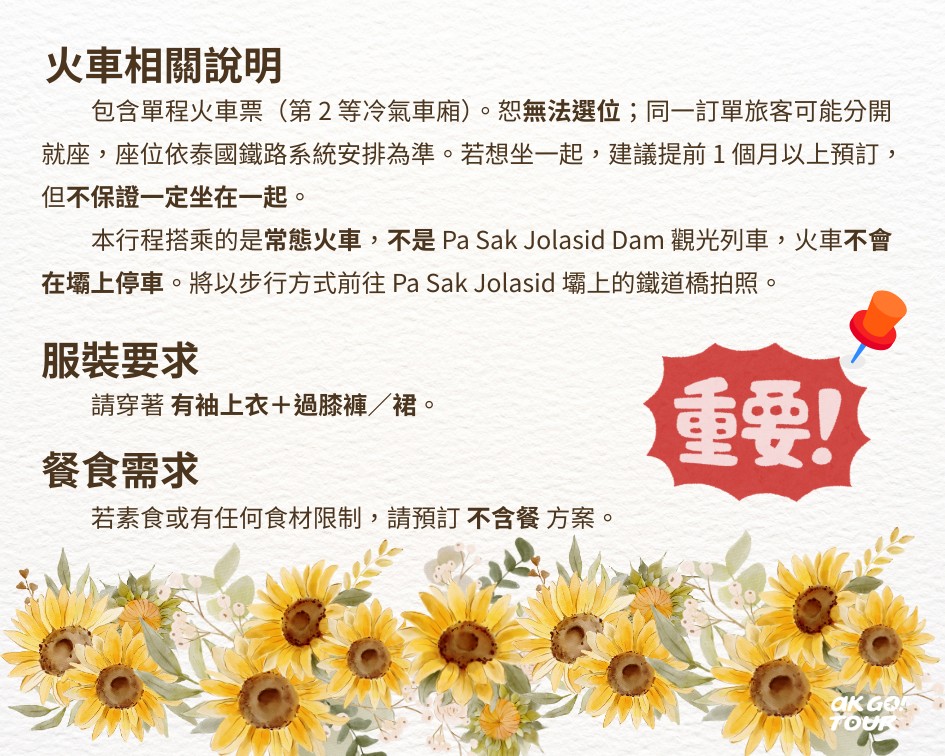 - 行程為固定時間,火車班次由泰國鐵路局管控,請務必準時集合。