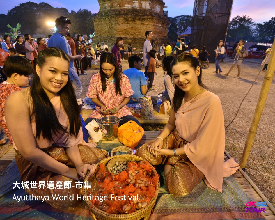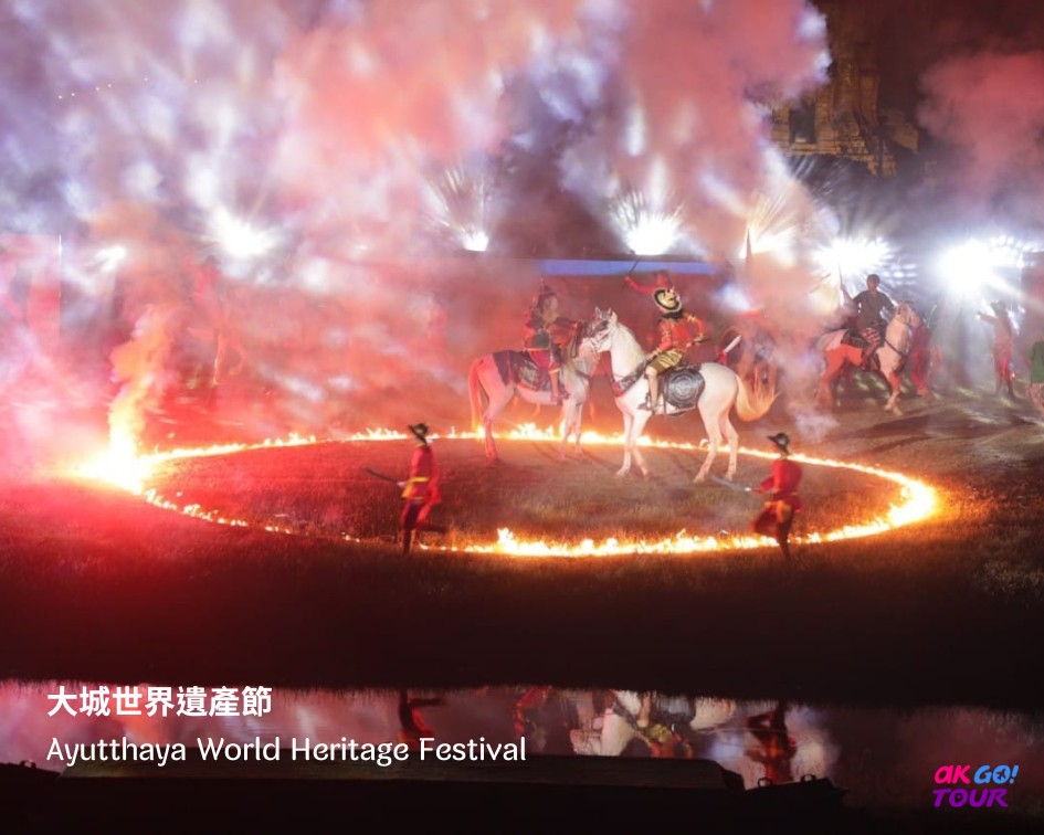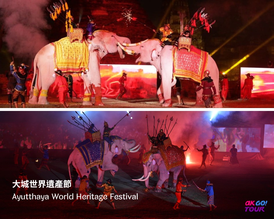 大城遺產節必看的聲光舞台劇,將燈光打在寶塔上,戰士們騎著大象,模擬大城時期的富盛繁榮到滅亡戰爭情節,氣勢磅礡的演出,豈容錯過!