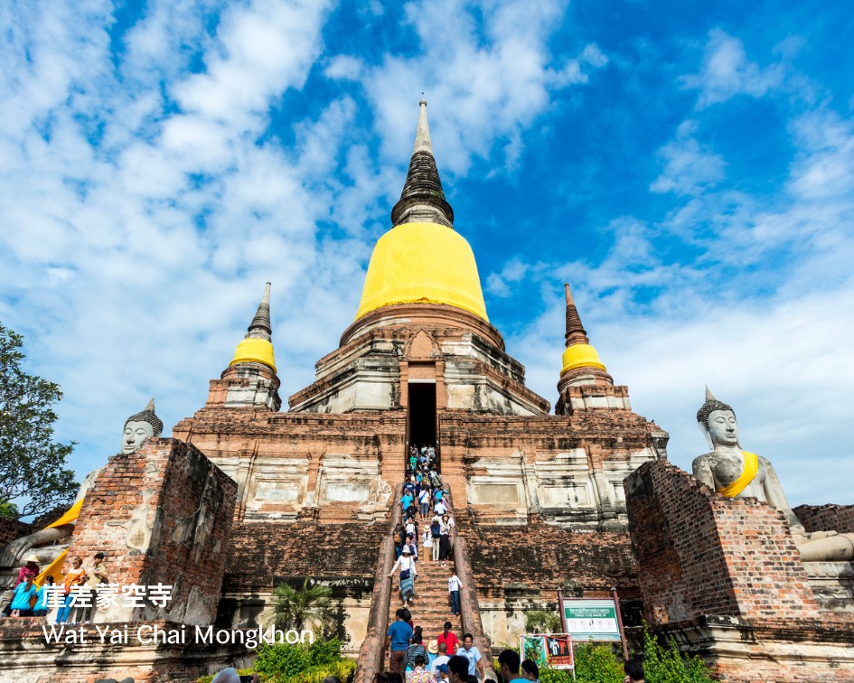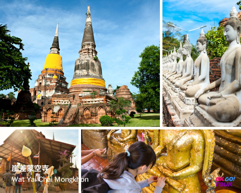 崖差蒙空寺,是大城府最古老的建築,這裡是以寶塔以及戶外臥佛為最有名,寺廟可以參拜、敲平安鐘,也可以爬到塔頂看看許願井。相傳如果可以把錢投到井中間的木框,願望就會實現。戶外小臥佛:相傳如果您可以把硬幣貼在佛腳,不會掉下來,即表示招好運、實現願望。