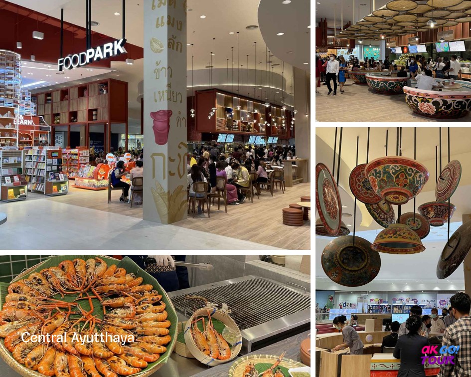 Central Ayutthaya二樓的美食廣場Food Park提供多樣化的泰國美食,地下G樓有Food Court,都可以品嚐到正宗的泰式日常美食及當地小吃,豬腿飯、煲仔飯、海南雞飯、泰式炒河粉、炸蠔餅,手搖飲、泰式甜點…價格實惠。裝潢帶有大城府的特色,如天花板上裝飾著編織的竹籃,記得抬頭瞧一瞧。