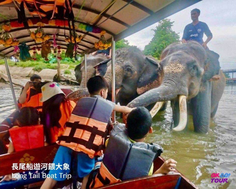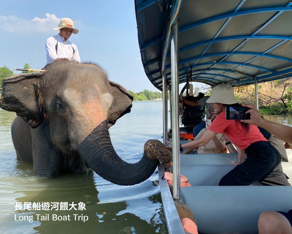4.搭乘長尾船悠遊河畔,邂逅並餵食可愛大象