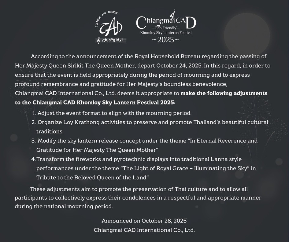依據王室事務局發布的詩麗吉王太后陛下辭世消息,清邁 CAD International Co., Ltd. 決定對 2025 年清邁 CAD 天燈節活動進行調整,以確保活動能在國喪期間合宜地舉行,並向女王陛下無限的慈愛與恩澤表達最深切的緬懷與感恩之意。