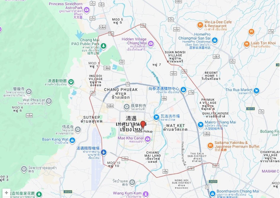 清邁市區。如圖中紅圈以內。超出範圍需加價接送,請洽客服。