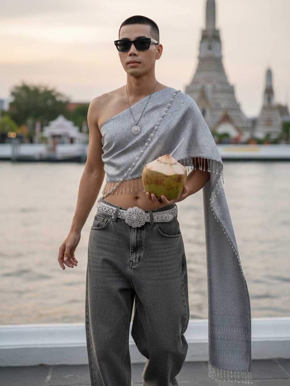 過去只在典禮、婚禮或宗教場合出現的泰式傳統服飾,如今透過嶄新的混搭語彙,與牛仔褲、球鞋、墨鏡等現代單品結合,形成一種既保留文化底蘊,又符合都會生活節奏的全新風格——「Modern Thai」。