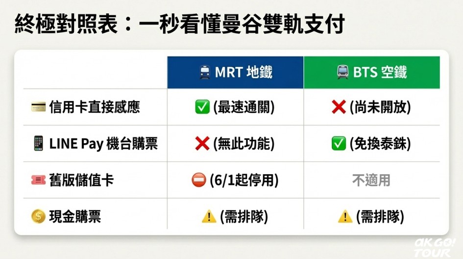 2026最新消息!用信用卡就可以坐曼谷捷運啦!許多旅客關心「曼谷捷運怎麼搭最方便?」、「可以用信用卡或LINE Pay嗎?」等問題。其實目前曼谷的捷運目前有兩大營運系統,一個是MRT(俗稱地鐵,但它也有在空中行走的路段) 與BTS(俗稱空鐵)已進入不同發展階段,搭乘方式也有所差異。