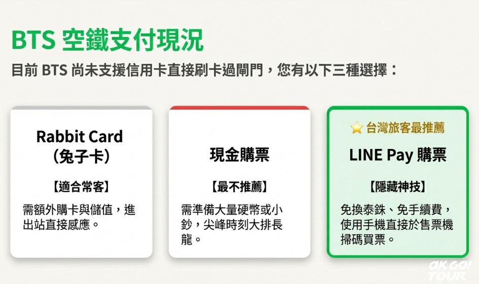 - BTS為主:Rabbit Card或LINE Pay皆適合
