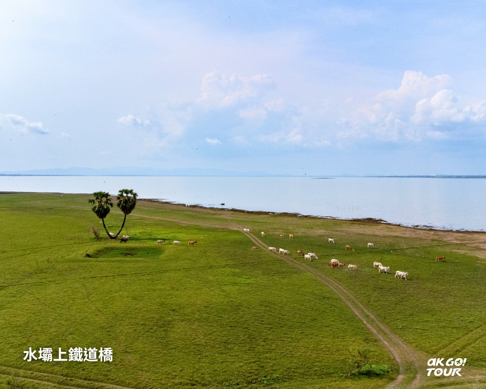 低水位期(3-10月): 湖水退去,露出廣闊的湖底草原,水壩變身為一片被譽為「泰國紐西蘭」的草原牧場風光。