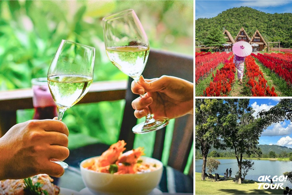 由專業導覽人員帶領,走入成排葡萄藤,實地認識 Shiraz、Tempranillo、Chenin Blanc 等品種如何在泰國熱帶高原中,孕育出與眾不同、享譽國際的得獎級風味。隨後進入釀酒廠與木桶窖藏空間,了解發酵與熟成的細節。導覽結束後,於品酒室品嚐三款經典酒款,未飲酒者可選擇莊園生產的鮮果汁,香氣層次細膩,是許多旅客回程前必買的紀念品。