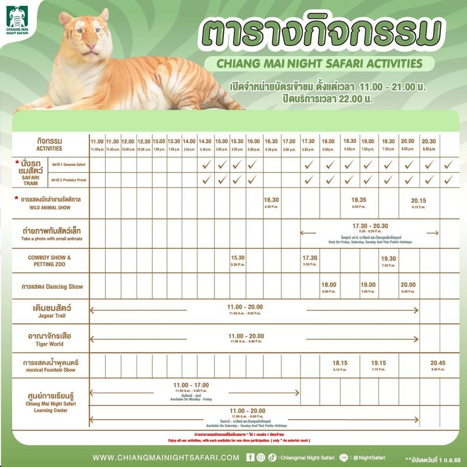 - 夜間遊園巴士營運時間為:17:30 - 21:00;每30分鐘一個梯次,遊園時間約1小時。提供中文、英文、泰文導覽。共有17:30, 18:00, 18:30, 19:00, 19:30, 20:00, 20:30, 21:00等梯次。