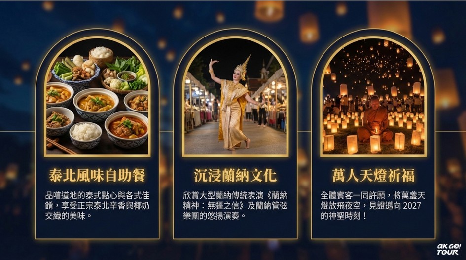 您可以親手施放天燈,將自己的心願隨著天燈一同升空,為 2027 年祈福。除了天燈之外,還可以欣賞到大型蘭納傳統表演 《蘭納精神:無疆之信》、蘭納管弦樂團 的悠揚演奏,以及午夜時分震撼全場的壓軸盛大煙火秀。