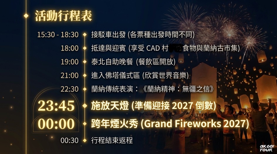 CAD 跨年門票極為搶手,趕快預訂,一起到清邁參與這場浪漫的天燈盛會,用最燦爛的方式迎接 2027 年!