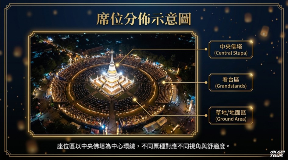 • 一般後排席 (Standard Seat): 座位位於看台前方地面區域,含往返接送、天燈及餐點。