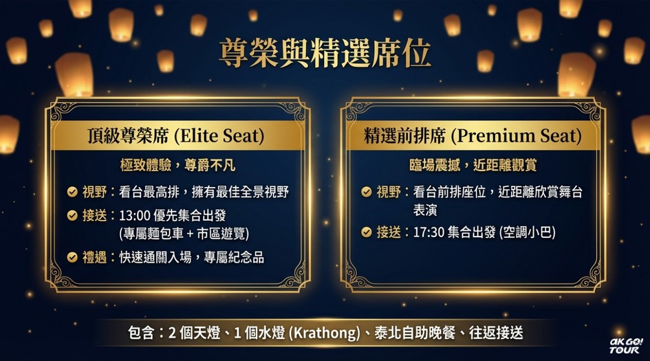• 精選前排席 (Premium Seat): 座位位於前排區域,靠近表演舞台,含往返接送、天燈及餐點。