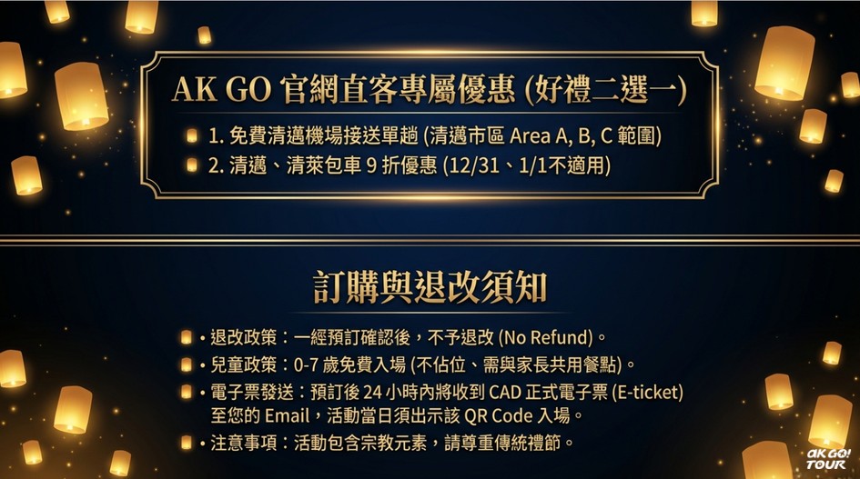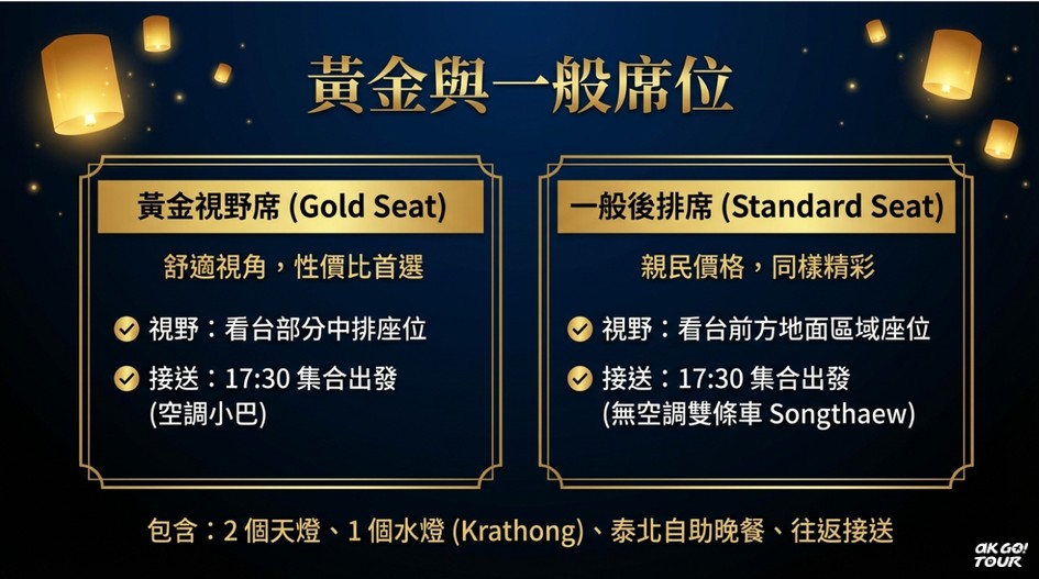 • 黃金視野席 (Gold Seat): 座位位於中排區域,含往返接送、天燈及餐點。