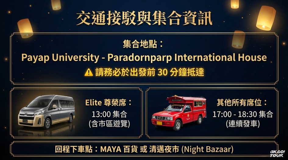 ◦ 頂級尊榮席 (Elite): 13:00 起搭乘空調專車出發。
