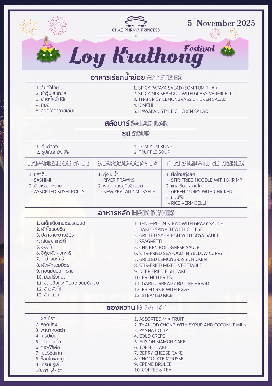 昭披耶河公主號在 2025 年 Loy Krathong 節慶晚宴,獻上豐盛自助饗宴。開胃菜有:泰式青木瓜沙拉、海鮮粉絲沙拉、香茅雞肉沙拉、韓式泡菜與夏威夷雞肉沙拉,清爽開場。湯品則有泰式酸辣蝦湯或濃郁松露濃湯,讓味蕾暖身。沙拉吧自取區之外,日式料理區供應生魚片與綜合壽司卷,海鮮區則有河蝦與紐西蘭淡菜現場供應,讓人食指大動。泰式經典料理包含炒河粉(蝦)、綠咖哩雞與米粉甜點,結合傳統與節慶風味。